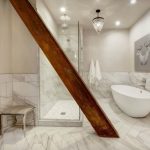 My favorite room was the gigantic master bath with an exposed original wood beam, huge egg shaped bath tub and marble herringbone tiles. The exposed beam is original and lends heaps of character to the room, while the delicate chandelier balances out rustic masculine elements.