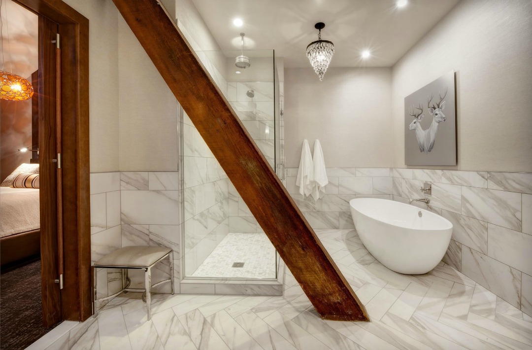 My favorite room was the gigantic master bath with an exposed original wood beam, huge egg shaped bath tub and marble herringbone tiles. The exposed beam is original and lends heaps of character to the room, while the delicate chandelier balances out rustic masculine elements.