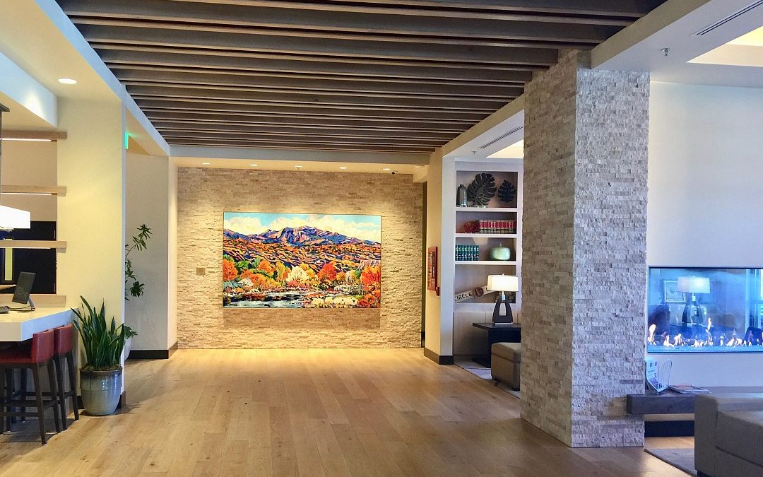 As soon as I walked in the door, my eye went right to the huge landscape by local artist JanyRae Seda. The movement and color in this painting is energizing and it sets the tone. There’s also a cowboy painting in the lobby by the same artist and more throughout the hotel–I love her work.