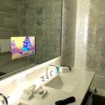 Honeycomb was a repeated geometric motif throughout the hotel and when I walked into the bathroom and saw the honeycomb marble I was in a design-swoon. It is stunning. There’s a soaking tub, shower and integrated tv in the mirror.