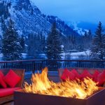 The lobby is huge and has a mountain lodge vibe. There’s a fireplace, floor to ceiling windows with gorgeous views, and shelves with books and board games. It’s an inviting space and opens up to a deck that has a fire pit overlooking the pool, river, and mountains.